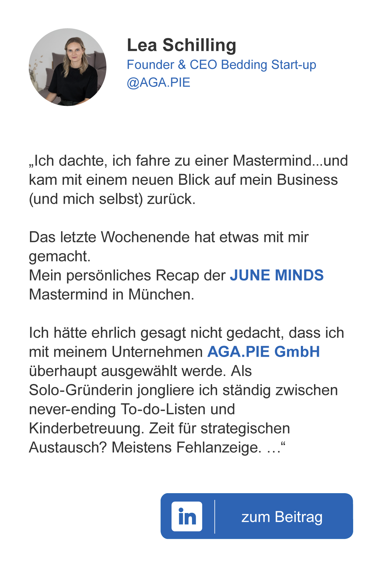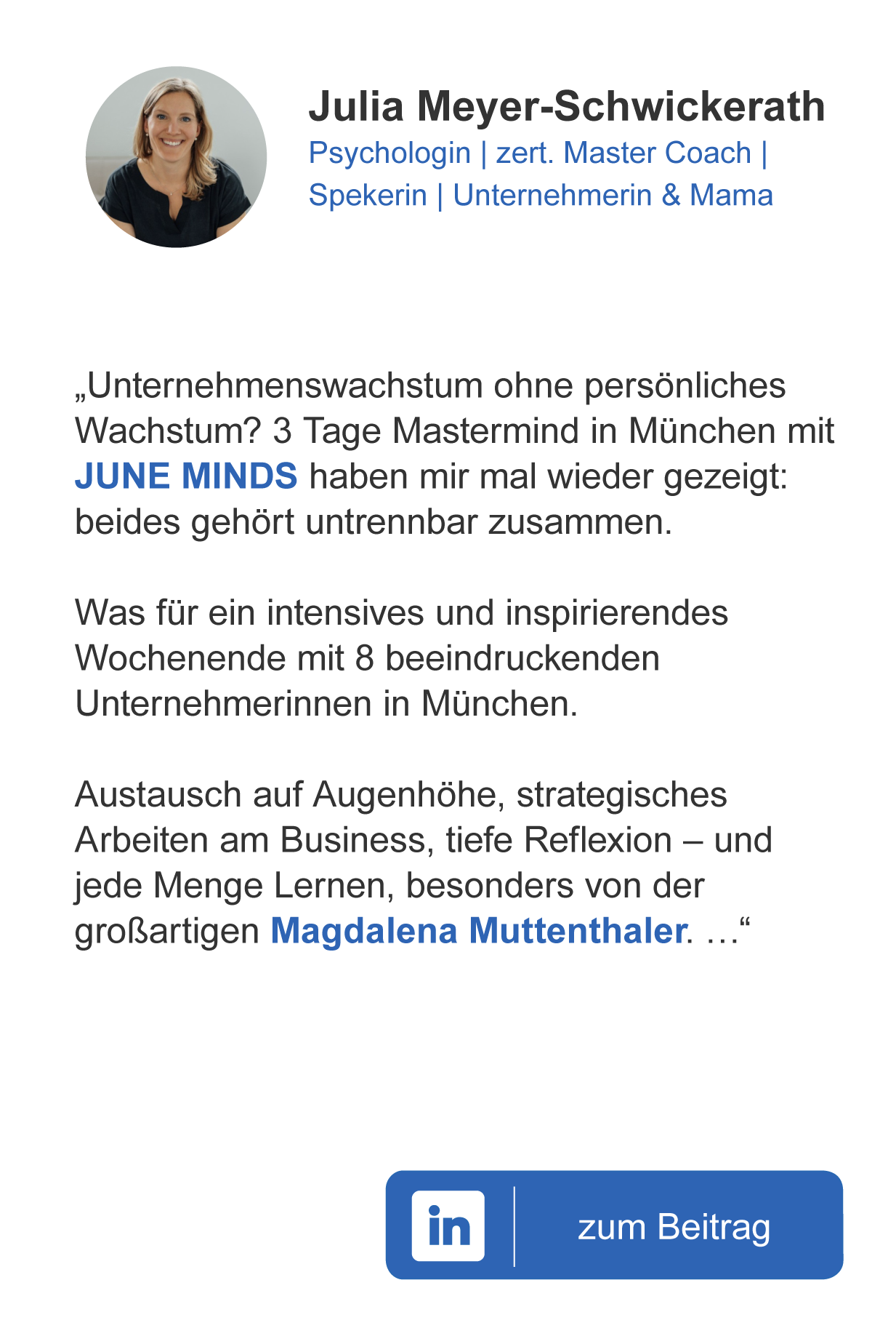 - Peer-to-Peer Feedback & Austausch mit den anderen Gründerinnen und Unternehmerinnen Deiner MASTERMIND